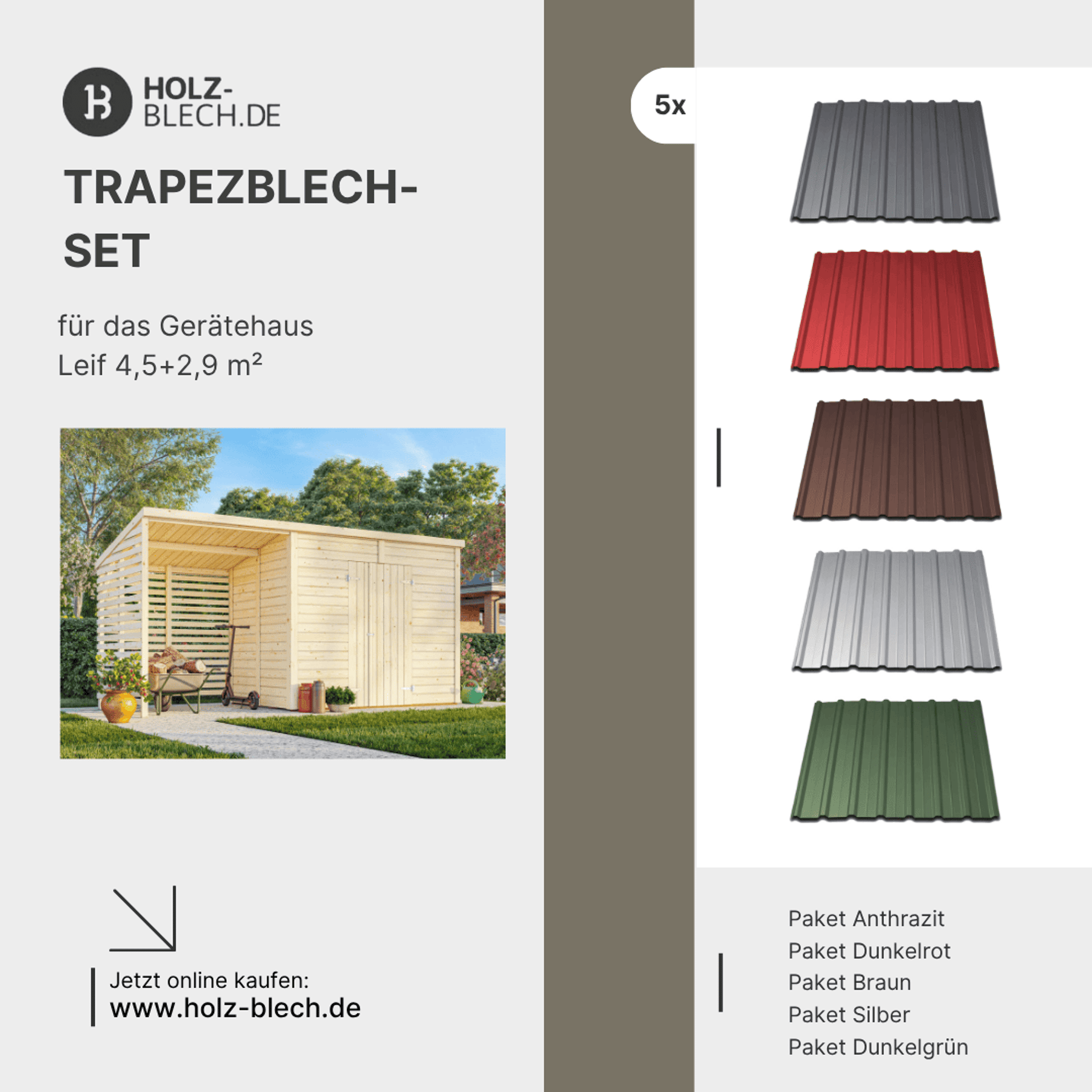 Unser erstklassiges Trapezblech-Set bietet Ihrem Gerätehaus Leif 4,5+2,9 m² nicht nur den idealen Schutz vor Witterungseinflüssen, sondern sorgt zugleich für eine moderne und elegante Optik. Dieses Komplettpaket ist speziell für Gerätehauser mit einer Grundfläche von 4,5+2,9 m² konzipiert und bietet eine langlebige und optisch ansprechende Dachlösung für Ihr Gerätehaus.