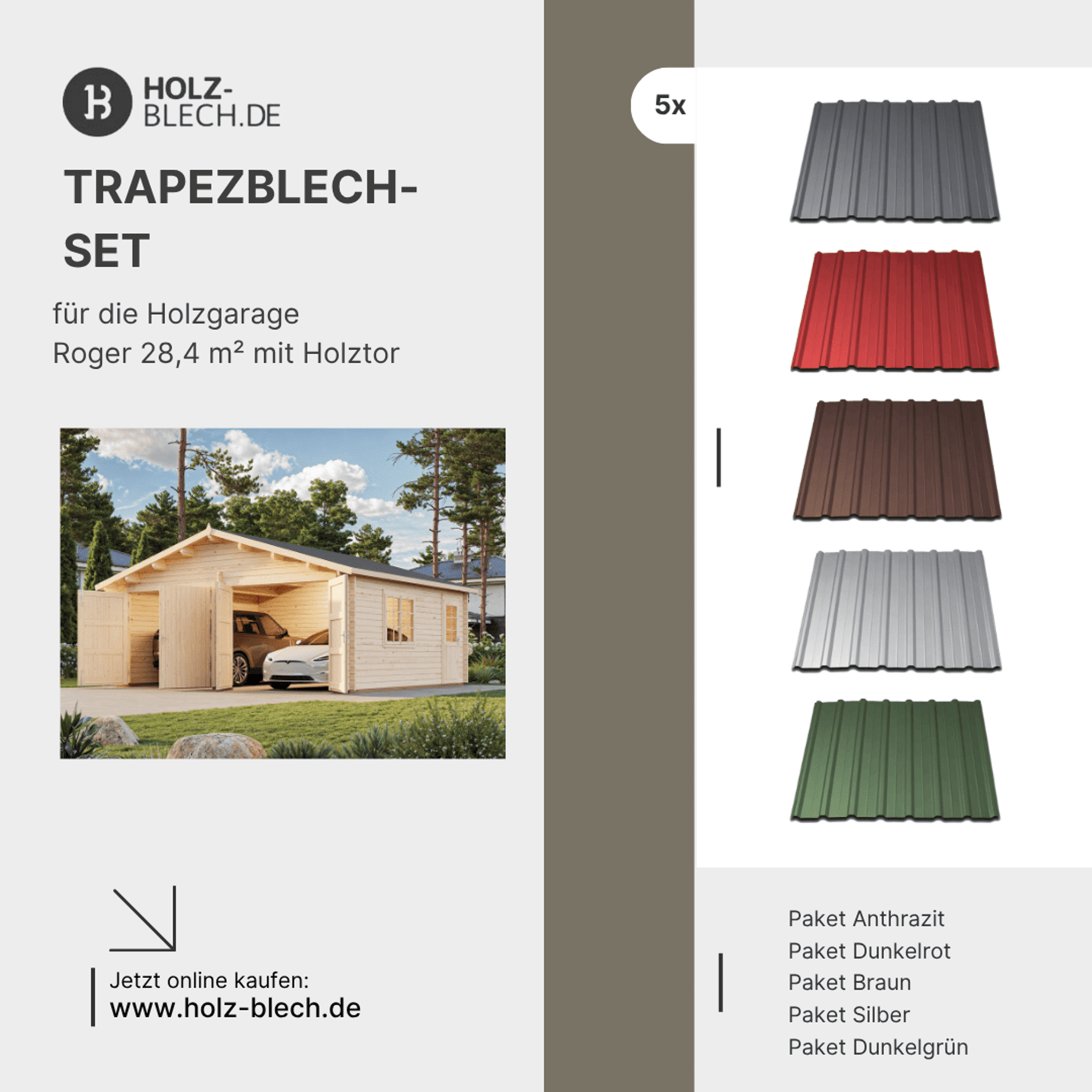 Trapezblech Set für Holzgarage Roger 28,4 m² mit Holztor