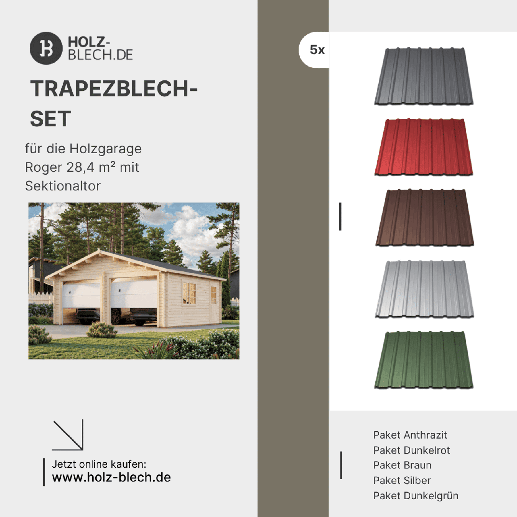 Zusammenfassung - Trapezblech Set für Holzgarage Roger 28,4 m² mit Sektionaltor