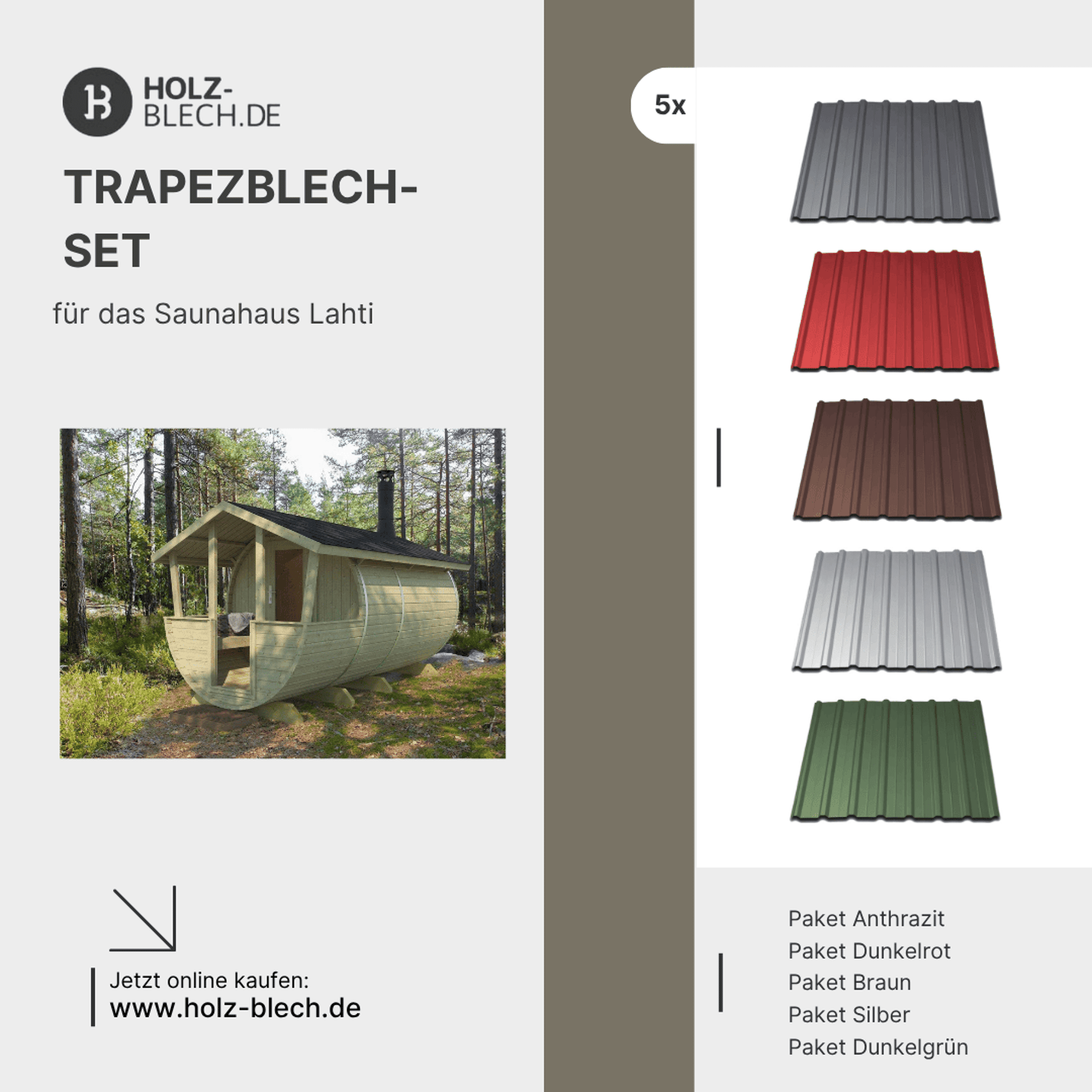 Schützen Sie Ihr Saunahaus Lahti verlässlich mit unserem erstklassigen Trapezblech-Set. Nutzen Sie die Vorzüge von haltbaren Materialien, einfacher Installation und einem eleganten Design. Bestellen Sie noch heute und profitieren Sie von unseren zügigen Lieferzeiten!